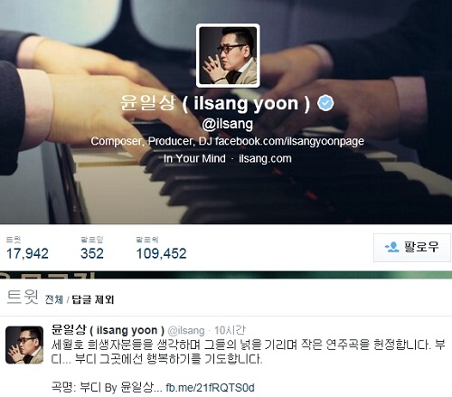 윤일상은 23일 오전 자신의 트위터에 “세월호 희생자 분들을 생각하며 그들의 넋을 기리기 위해 작은 연주곡을 헌정합니다. 부디. 부디 그 곳에서는 행복하기를 기도합니다”라는 글과 함께 헌정곡을 첨부했다.