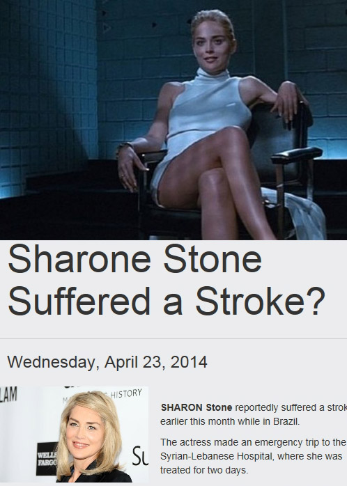 보도에 따르면 샤론 스톤은 최근 방문한 브라질에서 뇌졸중 증세를 보이며 쓰러졌다. 곧바로 병원으로 옮겨진 뒤 이틀간 입원 치료를 받고 퇴원했다.