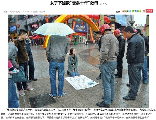 사진 속 푸펀은 “내 어머니의 생명을 구해주면 그를 위해 10년간 무료로 일하겠다”고 적힌 피켓을 앞에 놓고 무릎을 꿇은 채 눈물을 흘리고 있다.