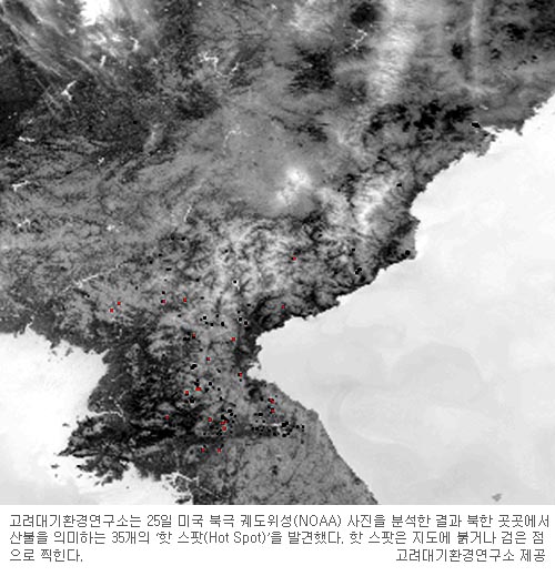 민간 연구소인 충북 청원군 고려대기환경연구소는 이날 오후 1시쯤 미국 북극 궤도위성(NOAA) 사진을 적외선 센서로 분석한 결과, 북한 35개 지점에서 산불을 의미하는 ‘핫 스팟(Hot Spot)’이 발견됐다고 밝혔다.