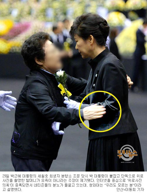 인터넷에서는 “실제로 조문 동영상을 보면 박 대통령과 사진을 찍은 할머니가 계속 대통령 옆에서 따라다니는 등 동선이 수상하다” “위로 사진조차 조작이라면 박 대통령은 정말 큰 역풍을 맞게 될 것”이라는 비판글이 나오고 있다. 일부 네티즌들은 할머니가 빨간 매니큐어를 바르고 있었다며 유가족이 아닐 가능성이 높다는 글을 올리기도 했다.