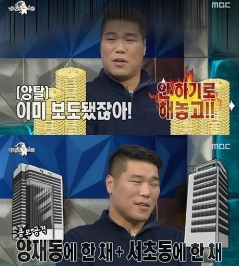 서장훈이 크게 당황하며 “그런 것 안하기로 하지 않았냐”고 말을 막자 김구라는 “내가 특종 터뜨린 것도 아니지 않냐. 이미 보도된 내용”이라며 “양재동에 한 채. 서초동에 한 채 있다”고 덧붙여 웃음을 자아냈다.