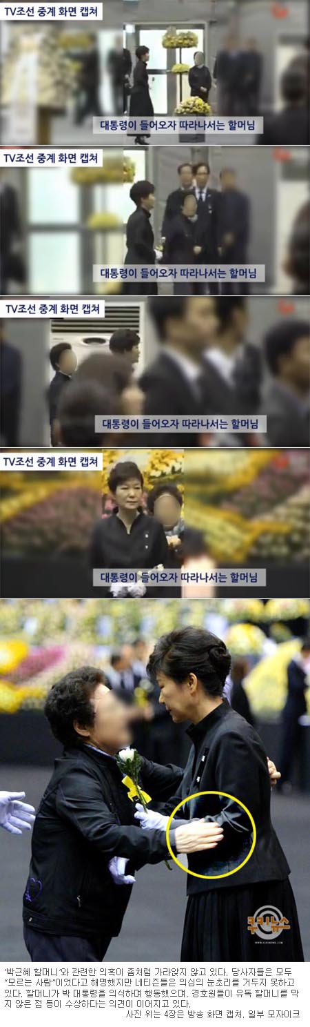 네티즌들은 박 대통령이 조문한 시간이 일반인 조문객은 없는 시간대였고, 할머니가 박 대통령을 지근거리에서 따라다니는데도 경호원들이 이를 막지 않은 점을 수상하게 보고 있다. 또 박 대통령이 왜 유족이 아닌 일반인과 단독으로 위로를 나눴는지도 의심하고 있다. 할머니 측과 청와대의 해명이 미묘하게 다른 점도 논란거리다.