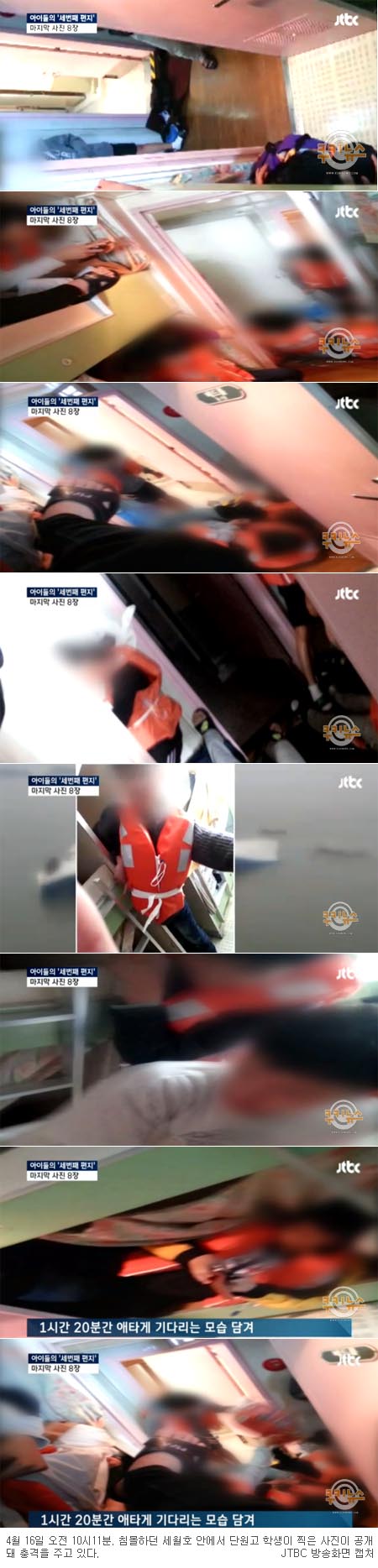 JTBC는 사진 속 아이들의 얼굴이 상당히 굳어 있었으며, 배가 심하게 기울어 학생들이 침대와 바닥, 벽에 간신히 기대 있다고 전했다. 또 객실에는 아직 물이 차지 않아 이 때라도 빨리 탈출했다면 배를 빠져나가 구조될 가능성이 있었다고 분석했다.