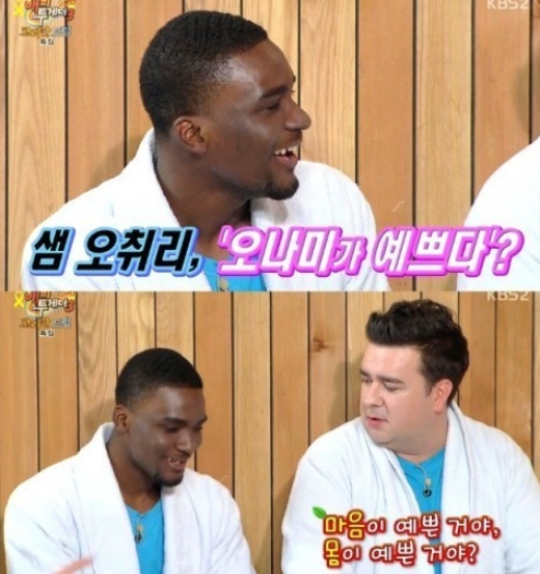 그러자 샘 해밍턴이 “저번에 몸이 예쁘다고 하지 않았느냐”고 캐물었고, 파비앙도 “몸이 착하다고 했다. ‘와 죽인다’ 그러면서”라고 한마디 거들었다. 이에 당황한 샘 오취리는 “(오나미가) 마음도 예쁘고, 몸도 예쁘고 얼굴은 잘생긴 편”이라고 해명해 웃음을 자아냈다.