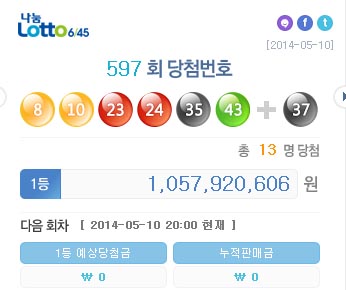 [쿠키 경제] 나눔로또는 제597회 로또복권을 추첨한 결과 8, 10, 23, 24, 35, 43 등 6개가 1등 당첨번호로 뽑혔다고 10일 밝혔다.