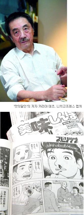 [쿠키 지구촌] 일본 정부가 ‘맛의 달인’의 저자 카리야 테츠(73)에 대해 불쾌감을 드러냈다. 만화에서 비과학적인 방법으로 후쿠시마 원전 사태의 심각성을 묘사했다는 것인데, 일본 우익 네티즌들은 카리야를 겨냥해 험악한 말을 쏟아내고 있다.