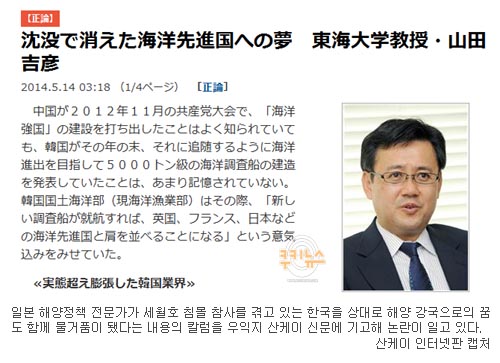 일본 해양정책 전문가가 세월호 침몰 참사를 겪고 있는 한국을 상대로 해양 강국으로의 꿈도 함께 물거품이 됐다는 내용의 칼럼을 우익지 산케이 신문에 기고해 논란이 일고 있다. 특히 북한 어뢰공격으로 침몰한 천안함 피격 침몰 사건을 한국 해군이 실수로 방치한 기뢰 탓으로 돌리거나 한국 해양경찰의 능력이 부족하니 일본의 연안 경비체제를 강화해야 한다는 황당한 주장을 펼쳐 눈살을 찌푸리게 하고 있다.