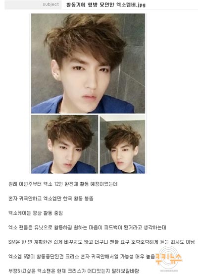 아이디 ‘trOOO’ 네티즌은 14일 오후 유명 커뮤니티인 베스티즈 게시판에 ‘활동기에 행방 묘연한 엑소 멤버’라는 제목으로 된 글을 올리고 크리스가 최근 모습을 드러내지 않고 있어 그룹 활동이 제대로 이뤄지지 않고 있다고 주장했다.