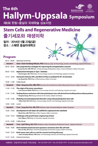 이번 심포지엄에는 기초 및 임상의학을 중심으로 중개연구가 활발한 세계적 명문 스웨덴의 웁살라대학교의 면역·유전·병리학과 교수들과 췌도세포, 당뇨병 대체요법, 파킨슨병, 신경발달장애, 피부재생, 줄기세포이식, 뇌종양 등 각종 난치병 분야에서 줄기세포와 재생의학의 활용과 전망에 대한 최신 지견을 공유한다.