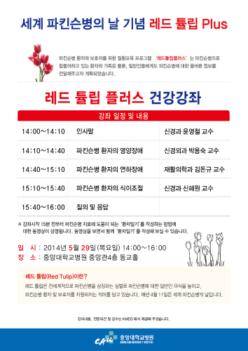 [쿠키 건강] 중앙대학교병원이 오는 29일(목) 오후 2시부터 병원 중앙관 4층 동교홀에서 파킨슨병 환자와 보호자를 위한 교육 프로그램인 ‘레드튤립(Red Tulip) 플러스 건강강좌’를 개최한다.