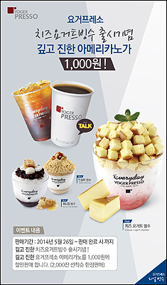 [쿠키 생활] ㈜현진푸드빌의 멀티 디저트 카페 요거프레소가 오늘(26일)부터 ‘카카오톡’ 선물하기 브랜드숍에 입점돼 있는 모바일 상품권(스마트콘) 중 아메리카노를 1000원에 판매하는 프로모션을 진행한다. 요거프레소의 여름시즌 신메뉴 치즈 요거트 빙수 출시기념으로 진행되는 깜짝 이벤트다.