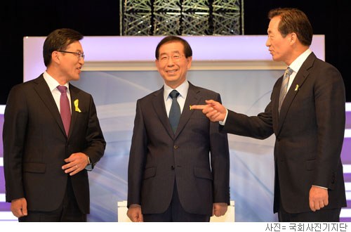 [쿠키 정치] 6·4 지방선거 서울시장 선거에 출마한 새누리당 정몽준·새정치민주연합 박원순·통합진보당 정태흥 후보가 두 번째 토론회에서 열띤 신경전을 벌였다.