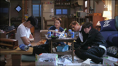 지난 21일 방영된 너포위 5화(수도권 시청률 13.5%로 수목극 1위)에서 이승기(은대구 분), 고아라(어수선 분), 안재현(박태일 분), 박정민(지국 분)은 함께 사는 공무원 아파트에 모여 앉아 치킨과 맥주를 앞에 두고 이야기를 나눴다.