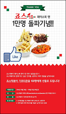㈜죠스푸드에서 운영하는 죠스떡볶이는 죠스떡볶이의 기존 팬과 새로운 팬 모두 함께 죠스떡볶이 페이스북 1만 팬 돌파를 축하하고 기념하기 위해 이번 이벤트를 마련했다.