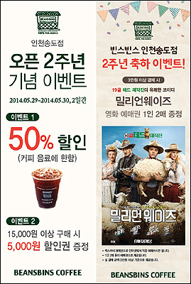 [쿠키 생활] 커피&와플 전문점 빈스빈스 인천 송도점이 오픈 2주년을 맞아 파격적인 할인 프로모션과 푸짐한 경품을 증정하는 행사를 28~29일 양일간 진행한다.