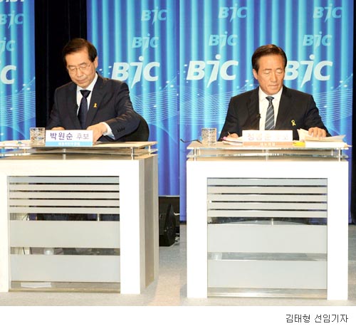 정 후보의 공격이 매서웠다. 각종 여론조사에서 밀리는 것을 의식한 듯 박 후보를 겨냥해 “박 후보 말씀은 사실을 전부 왜곡하고 부정, 억지가 너무 심하다”며 “한마디로 거짓말이 박원순 스타일”이라고 몰아붙였다. 정 후보는 박 후보에게 “길게 답변하지 말고, ‘예, 아니요’라고 답변해 달라”며 취조하듯 말하기도 했다. 이 과정에서 정 후보가 박 후보의 어투를 성대모사해 실소를 자아냈다.
