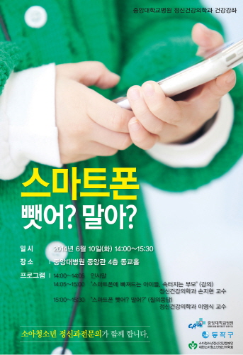 [쿠키 건강] 중앙대학교병원이 오는 6월 10일(화), 오후 2시부터 병원 중앙관 4층 동교홀에서 ‘스마트폰 뺏어? 말아?’라는 주제로 건강강좌를 개최한다.