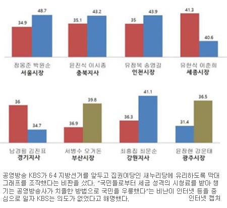 이밖에도 KBS는 새누리당 후보가 뒤지는 충북지사나 인천시장의 그래프는 격차를 작게 표현하고 새누리당 후보가 앞서는 경기지사의 그래프는 비정상적으로 크게 그려 넣었다.