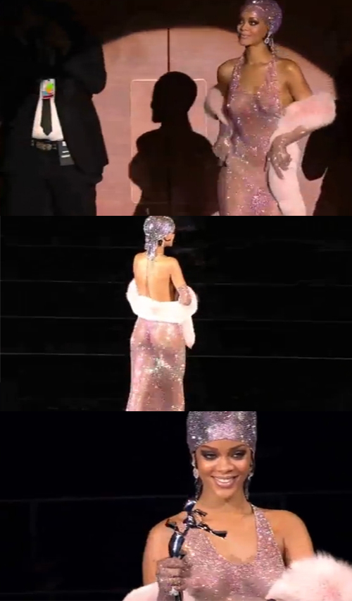 당시 리한나는 수상자로 호명된 뒤 밝은 미소를 지으며 무대에 올랐다. 사람들의 시선은 그의 드레스에 집중됐다. 전신이 훤히 들여다보이는 파격적인 시스루 드레스였다. 드레스 안에는 티팬티 하나만 챙겨 입었다. 다소 민망한 의상에도 그는 연신 당당한 표정을 지으며 육감적인 몸매를 뽐냈다.