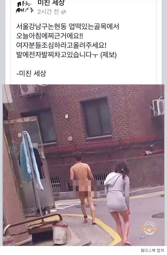 [쿠키 사회] 서울 강남 논현동의 빌라촌에서 벌거벗은 채 발목에 전자발찌를 차고 거리를 활보하는 남성을 촬영한 사진이 페이스북을 강타하고 있다. 네티즌들은 특히 남성의 뒤를 한 여성이 맨발로 쫓고 있는 긴박한 장면에 경악하고 있다.