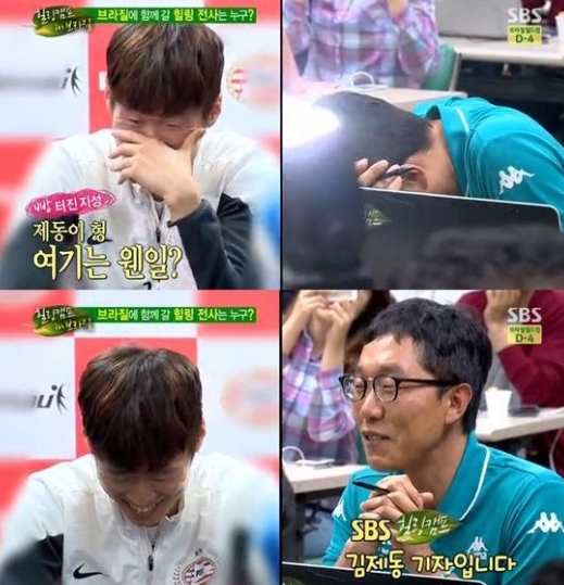 김제동은 박지성이 등장하기 전 다른 기자에게 조언을 구하며 나름의 준비를 단단히 했다. 하지만 박지성은 기자석에 있던 김제동을 발견하고 순간 당황해 웃음을 터뜨렸다. ‘빵 터진’ 박지성은 고개를 숙이고 계속 웃었고 김제동 역시 웃음을 참지 못하고 고개를 숙였다.
