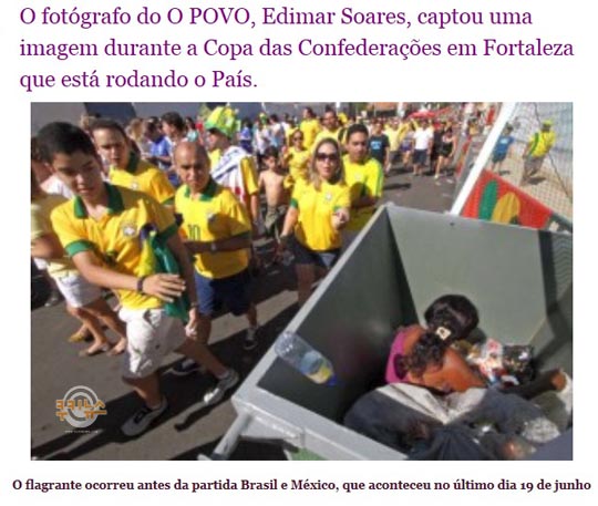 사진에는 축구 응원을 하러 가는 브라질 시민들이 쓰레기통에 뭔가를 던지고 있고, 그 쓰레기통 안에는 머리를 뒤로 묶은 여성이 앉아서 쓰레기 더미를 뒤적이는 장면이 담겨 있습니다.