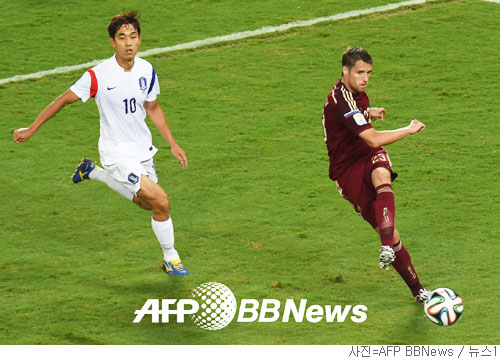 박주영은 18일 브라질 쿠이아바 아레나 판타날에서 열린 러시아와의 대회 조별리그 H조 1차전에서 공격수로 선발 출전, 득점 없이 맞선 후반 10분 이근호(29·상주 상무)와 교체됐다. 홍명보(45) 감독의 첫 번째 교체다. 이근호는 박주영을 대신해 최전방으로 배치됐다.
