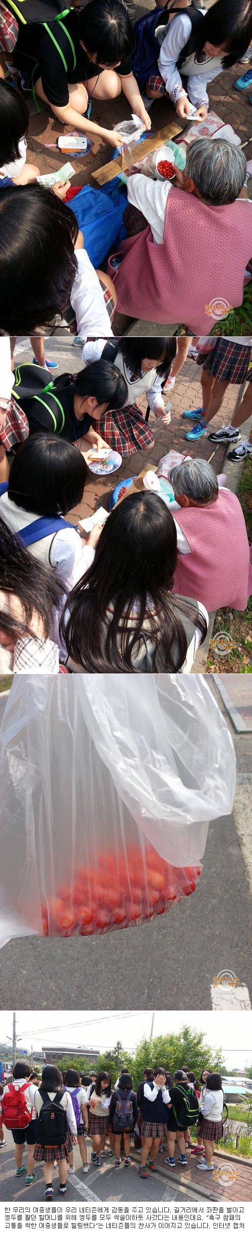 한 무리의 여중생들이 우리 네티즌에게 감동을 주고 있습니다. 길거리에서 좌판을 벌이고 앵두를 팔던 할머니를 위해 앵두를 모두 싹쓸이하듯 사갔다는 내용인데요. “축구 참패의 고통을 착한 여중생들로 힐링했다”는 네티즌들의 찬사가 이어지고 있습니다.