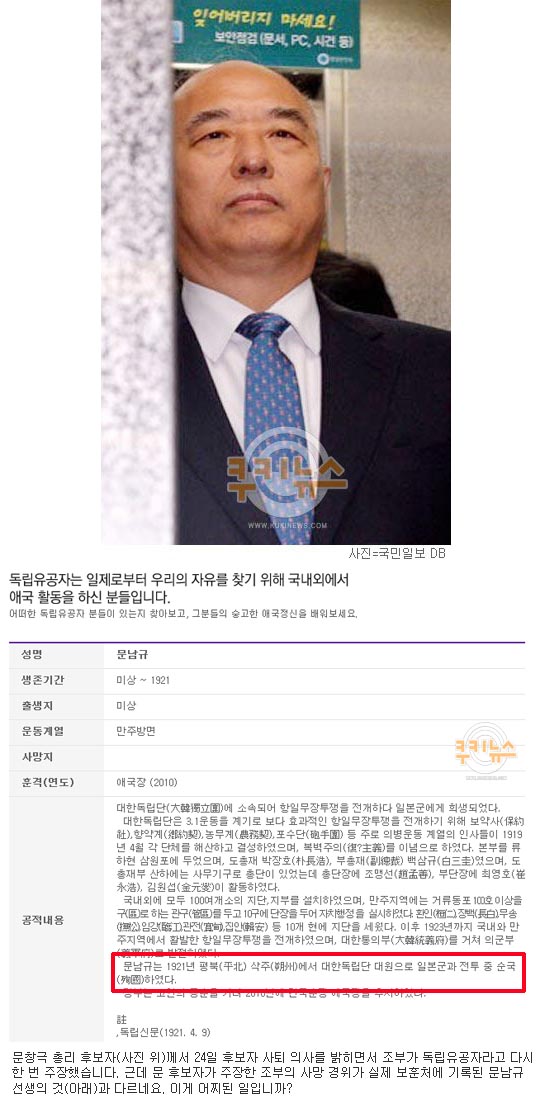 이상하지 않습니까? 문 후보자는 분명 “할아버지가 3·1운동 때 만세를 부르다 돌아가셨다”고 했는데 정작 독립유공자 문남규 선생 공식 기록에는 그런 말이 없습니다. 독립유공자 문남규 선생은 실제로 총칼을 들고 일제의 군대와 맞서 싸운 투사입니다. 만세운동은 아시다시피 평화운동이었고요.