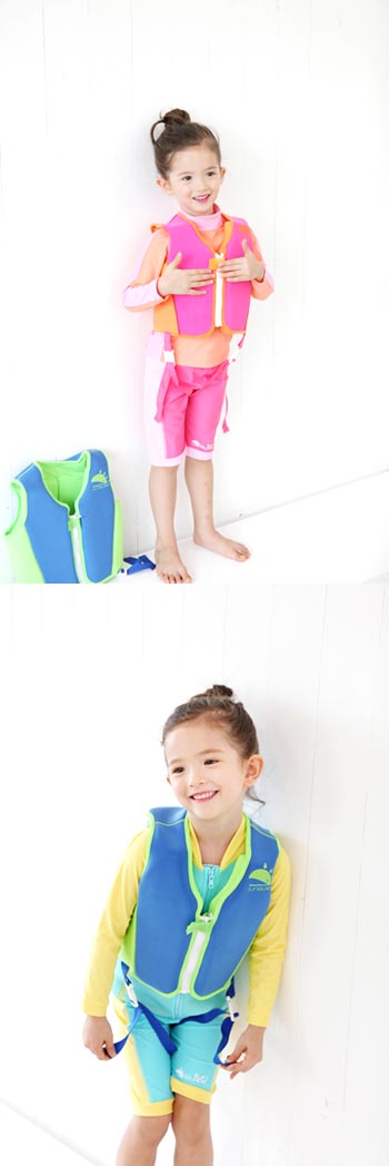 앞 지퍼가 있는 자켓 형태로 아이들이 쉽게 입고 벗을 수 있도록 돼있다. 6개의 부력재가 부착돼 있어 아이들이 물 위에서 어떤 동작을 해도 안정적으로 물에 떠 있게 한다. 겉감의 네오프렌은 잠수복 소재로 보온성 외에도 자외선 차단 기능이 있어 아이들의 피부를 햇볕으로부터 지켜준다.