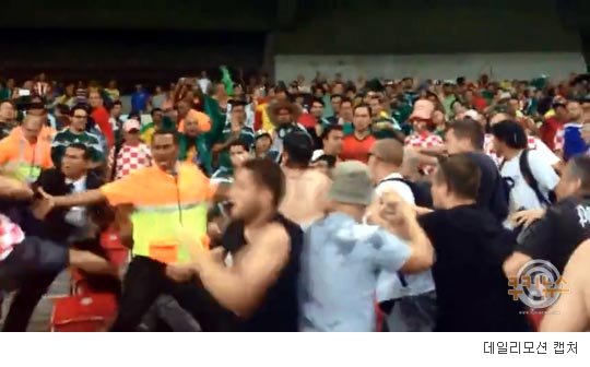 우리 시간으로 24일 오전 5시. 브라질월드컵 A조 조별리그 3차전 크로아티아와 멕시코의 경기가 열린 페르남부코 아레나의 관중석에서 흥분한 일부 관중들이 난투극을 벌이는 일촉즉발의 상황을 담은 동영상이 나왔습니다.