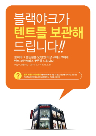 블랙야크가 텐트 보관서비스를 시작한다. 다음달 24일까지 캠핑용품 50만원 이상 구매고객에게 텐트 보관서비스 쿠폰을 증정한다.