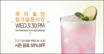 유러피안 라이프스타일 카페 아티제가 여성고객들을 위한 특별이벤트 수요일 3시30분(W330) 여섯 번째 순서를 맞아 2일과 9일 양일간 3시30분부터 한 시간 동안 여름 음료를 50% 할인된 가격으로 제공하는 행사를 진행한다.