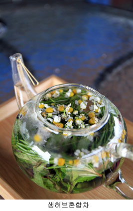 두 번째 추천 메뉴는 ‘생허브혼합차’다. 직접 키운 민트와 무농약 친환경 인증을 받은 ‘제주 허브올레’ 농장에서 공수하는 다양한 허브 생잎을 바로 우려먹는 차자. 캐모마일, 로즈메리, 스테비아, 각종 민트 등 약 5~6가지 허브를 한 데 담아 우려 마시는 ‘생허브혼합차’는 벌써부터 반응이 좋다. 보기에도 좋고, 맛도 좋고, 생산환경도 좋은 그야말로 ‘슬로’ 차다. 생허브는 그때그때 들어가는 것이 달라진다. 노지에서 키운 제철허브를 써야 하기 때문이다. 요즘 같은 여름철에는 허브 우린 물과 생잎을 함께 얼린 허브얼음을 동동 띄워주는 냉허브차도 좋다. 민트와 탄산수가 만난 논(Non)알코올 모히토도 추천한다.