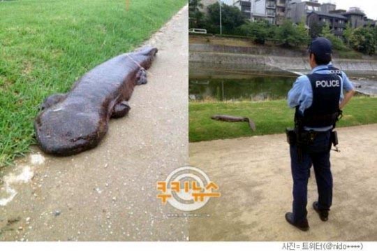 거대 도롱뇽 사진은 지난 3일 밤 트위터를 통해 나돌았습니다. ‘일본 지바현 남부의 가모가와라는 지역에서 거대한 무엇이 포착됐다’는 설명과 함께 사진이 오르내렸습니다.