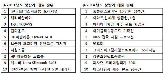 ◇Often Purchase: 반복구매 상품 증가= 올해 티몬의 상반기 매출 Top 10에 포함된 상품들의 개별 단가는 10만원 이하로 나타났다. 이는 지난해 노트북, 패키지여행상품 등 고가제품이 5개 이상 포함된 것과 정반대의 상황이다. 상위 10개 제품의 개별단가는 낮지만 매출은 70% 이상 상승하며 비교적 단가가 낮은 저렴한 상품에 대한 반복적인 구매가 이뤄지는 것으로 분석됐다.