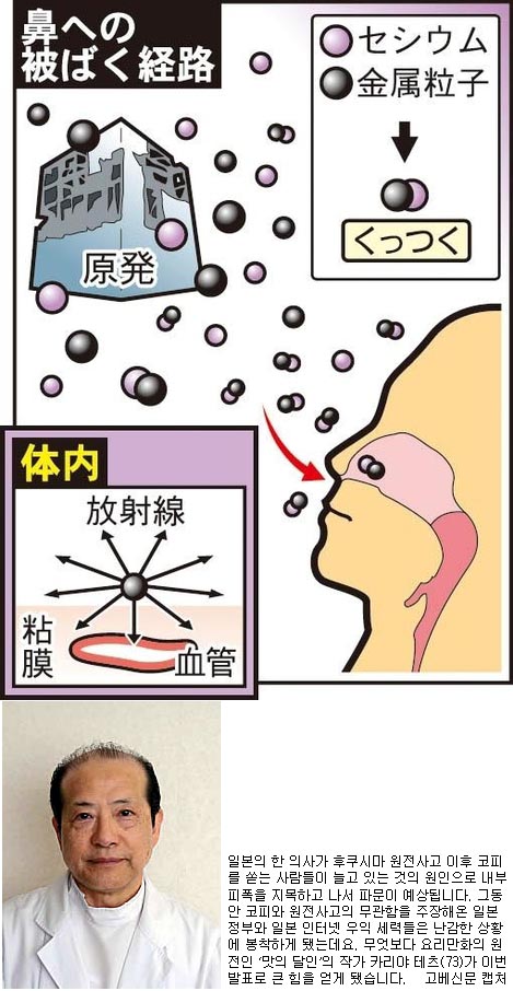 일본의 한 의사가 후쿠시마 원전사고 이후 코피를 쏟는 사람들이 늘고 있는 것의 원인으로 내부 피폭을 지목하고 나서 파문이 예상됩니다. 그동안 코피와 원전사고의 무관함을 주장해온 일본 정부와 일본 인터넷 우익 세력들은 난감한 상황에 봉착하게 됐는데요. 무엇보다 요리만화의 원전인 ‘맛의 달인’의 작가 카리야 테츠(73)가 이번 발표로 큰 힘을 얻게 됐습니다.