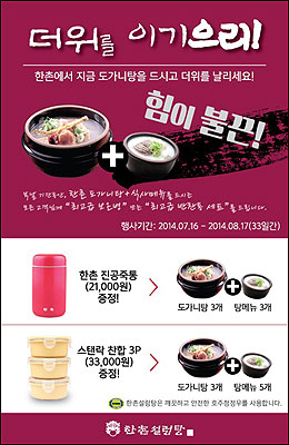 오늘(16일)부터 다음달 17일까지 33일간 진행되는 이번 이벤트는 식사를 한 고객들에게 한촌설렁탕 카드에 스티커를 붙이고, 한촌설렁탕이 추천하는 보양식인 도가니탕 3개와 그 외의 식사메뉴로 스티커를 이벤트 당첨 횟수만큼 붙일 경우 사은품을 증정하는 방식이다.