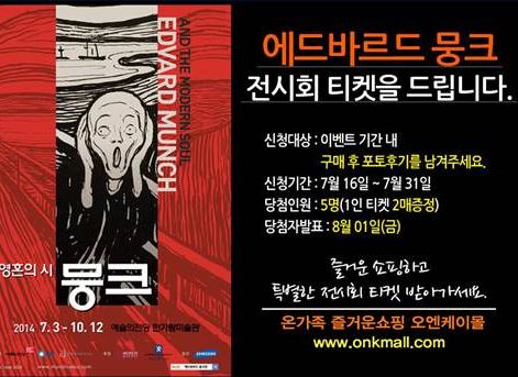 유아용품 전문쇼핑몰 오엔케이몰이 국내 4대 오픈마켓인 지마켓, 11번가, 옥션, 인터파크 등을 통해서 ‘뭉크-영혼의 시’ 티켓 증정 2차 이벤트를 오는 31일까지 진행한다.
