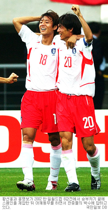 우리나라가 월드컵 4강에 진출한 순간이었습니다. 12년이 지났지만 그날을 생각하면 전율을 느끼는 축구팬이 많습니다. 스페인과의 승부차기 순서는 1990~2000년대 한국 축구의 시작과 끝을 보여준 상징과 같습니다. 우리나라의 최전방에는 ‘아시아 최고의 스트라이커’ 황선홍이, 최후방에는 ‘영원한 리베로’ 홍명보가 있었습니다.