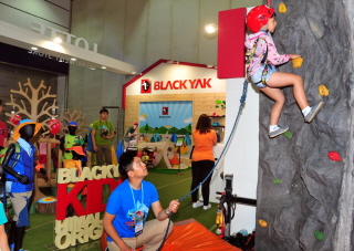 블랙야크 키즈 부스는 ▲고객이 직접 블랙야크 키즈 옷을 입고 촬영을 하는 포토존, ▲아동이 직접 체험 가능한 인공암벽 ▲부모들의 휴식공간 캠핑존, ▲블랙야크 키즈 의류 등의 제품전시코너 등으로 마련됐다.