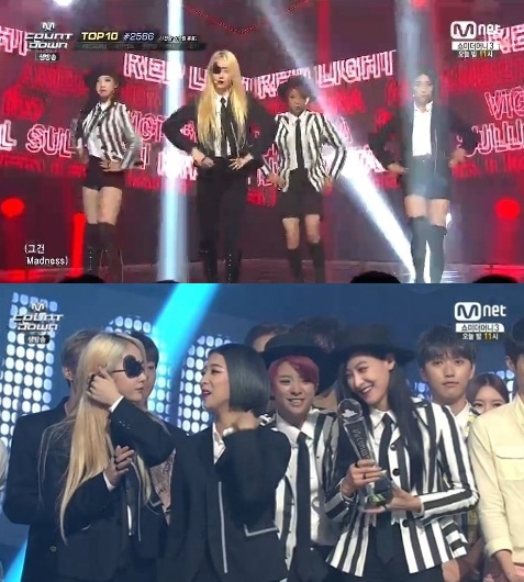 이날 에프엑스는 1위를 차지했다. 설리가 함께 트로피를 들어올리지 못해 아쉬움을 남겼다.