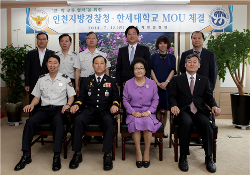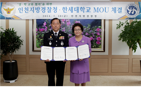 인천지방경찰청은 18일 청사 6층 미추홀실에서 이상원 청장과 한세대학교 김성혜 총장 등 양 기관 관계자 10명이 참석한 가운데 주요 치안정책의 공동 연구 및 전문 치안인력 양성 등을 위한 경·학 교류 협약식을 가졌다.