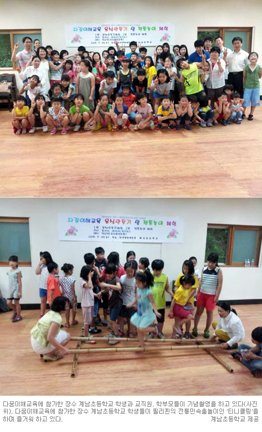 전북 장수 계남초등학교(교장 최봉식)가 다문화가정을 이해하기 위한 작은 잔치를 열었다. 계남초등학교는 18일 장안문화예술촌에서 전교생 다꿈이해교육 음식만들기와 전통놀이 체험을 실시했다.