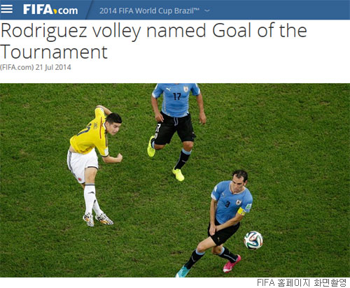 국제축구연맹(FIFA)은 22일 홈페이지를 통해 로드리게스가 지난달 29일 브라질 리우데자네이루 에스타디오 두 마라카낭에서 열린 우루과이와의 16강전에서 넣은 발리슛이 월드컵 최고의 골로 뽑혔다고 밝혔다.