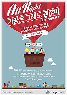 토크콘서트 티켓 예매는 인터넷 예매 사이트 ‘인터파크 티켓(ticket.interpark.com)’의 검색창에 ‘가끔은 그래도 괜찮아’를 입력하면 공연시간 전까지 예매가 가능하다. 콘서트와 관련된 생생한 정보는 토크콘서트 공식 트위터(twitter.com/allrightconcert)’를 통해 확인할 수 있으며, ‘스무디킹 페이스북(www.facebook.com/smoothieking.kr)’ 등 스무디킹 공식 SNS(소셜네트워크서비스)와 토크 MC, 토크 뮤지션들의 페이스북을 통해서도 콘서트 소식을 만나볼 수 있다.