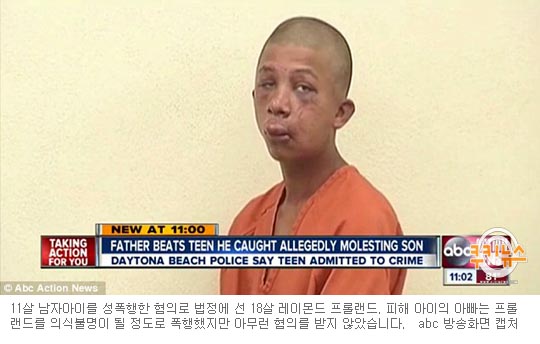 22일 AP통신과 데일리메일 등 보도에 따르면 35살 아빠 A씨는 지난 18일 새벽 음식을 사들고 집에 돌아왔다가 집에서 이상한 소리를 들었습니다. 11살 난 아들 B군 방에서 새어나오는 소리였습니다. 문을 박차고 들어가 보니 이웃집에 사는 레이몬드 프롤랜더라는 18살짜리 사내가 아들을 성폭행하고 있었습니다.