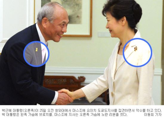 인터넷에서는 특히 박 대통령과 마스조에 지사가 악수하는 본보의 사진이 나돌았는데요. 우리 사진부 이동희 선배가 멋지게 잘 찍으셨네요. 이 사진이 나돈 건 바로 박 대통령의 왼쪽 가슴 브로치와 마스조에 지사의 오른쪽 가슴 노란 리본이 함께 잘 포착됐기 때문입니다.