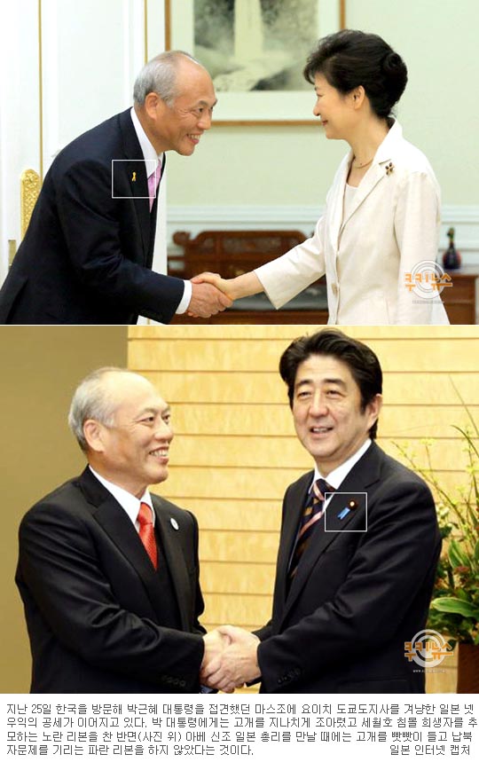 넷우익들은 마스조에 지사가 박 대통령을 만날 때에는 노란 리본을 차고 있는 사진과 함께 아베 일본 총리를 만나는 자리에서는 파란 리본을 단 아베 총리와 달리 아무것도 달고 있지 않은 사진을 비교해 올리고 있습니다. 넷우익들이 인터넷에 올리는 마스조에 지사와 박 대통령이 만나는 사진은 본보 이동희 선배가 찍은 거네요.